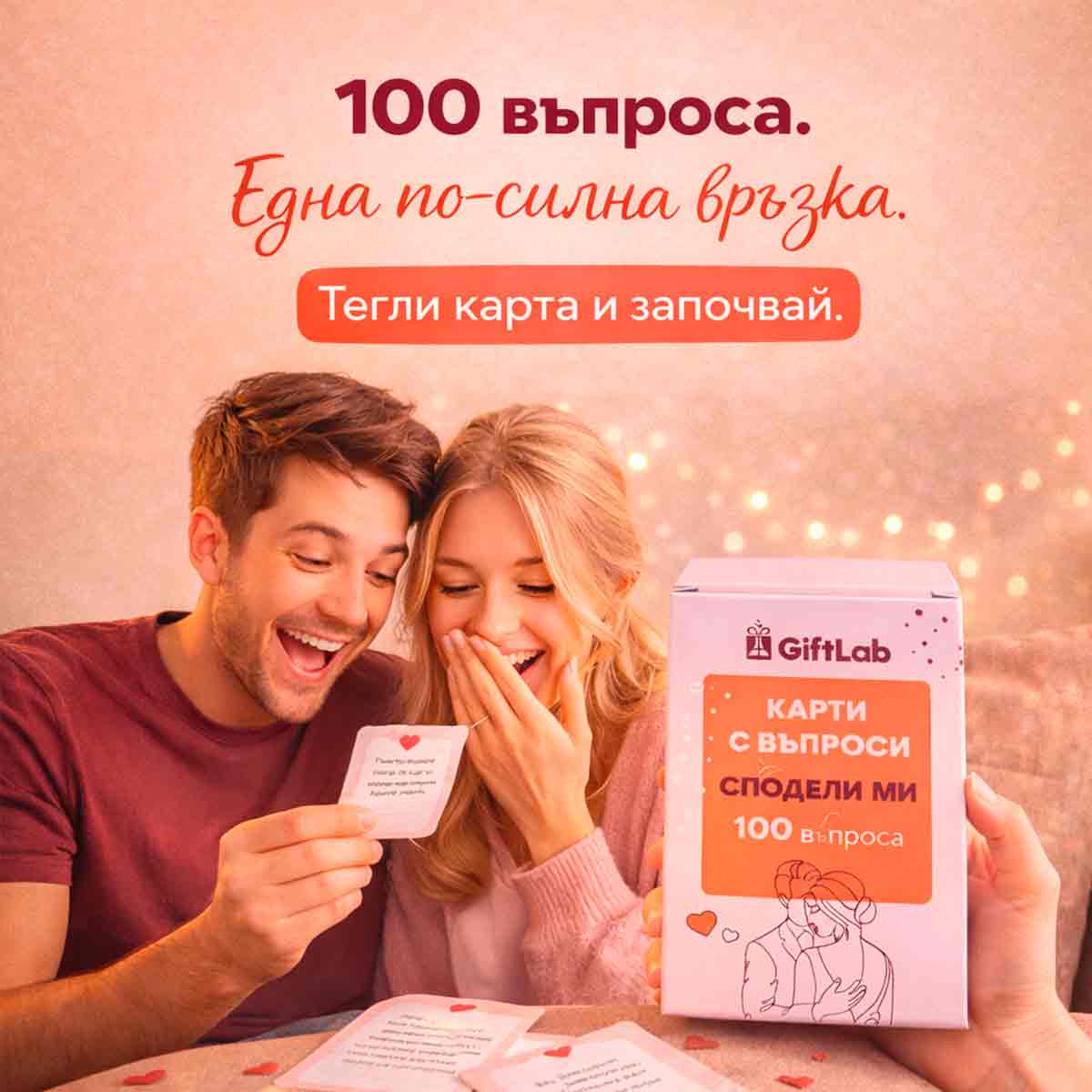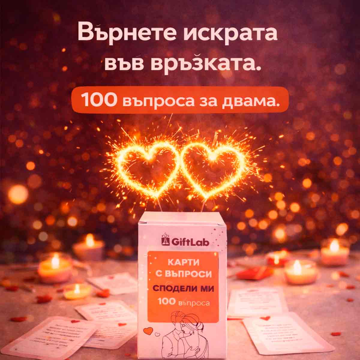 Комплектът с карти Сподели ми съдържа разнообразие от въпроси, които покриват различни аспекти на връзката. Те включват въпроси за любовта и романтиката, личните мечти и амбиции, ежедневните навици и предпочитания, както и дълбочинни размисли за отношенията и бъдещето. Въпросите са проектирани да стимулират открита и смислена комуникация, като предоставят на двойките възможност да се опознаят по-добре и да изградят по-дълбока емоционална връзка.